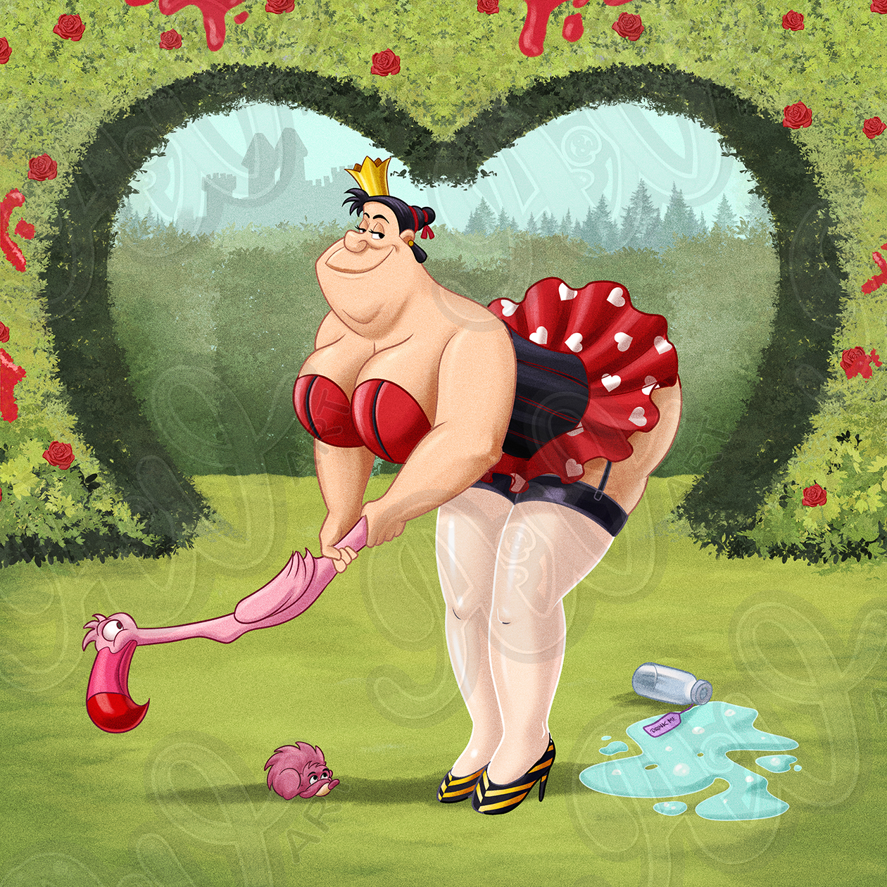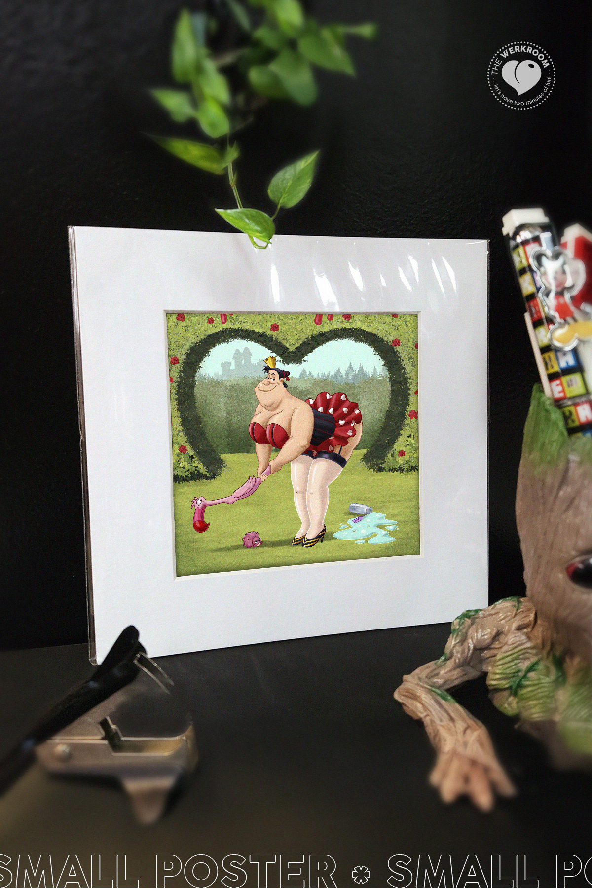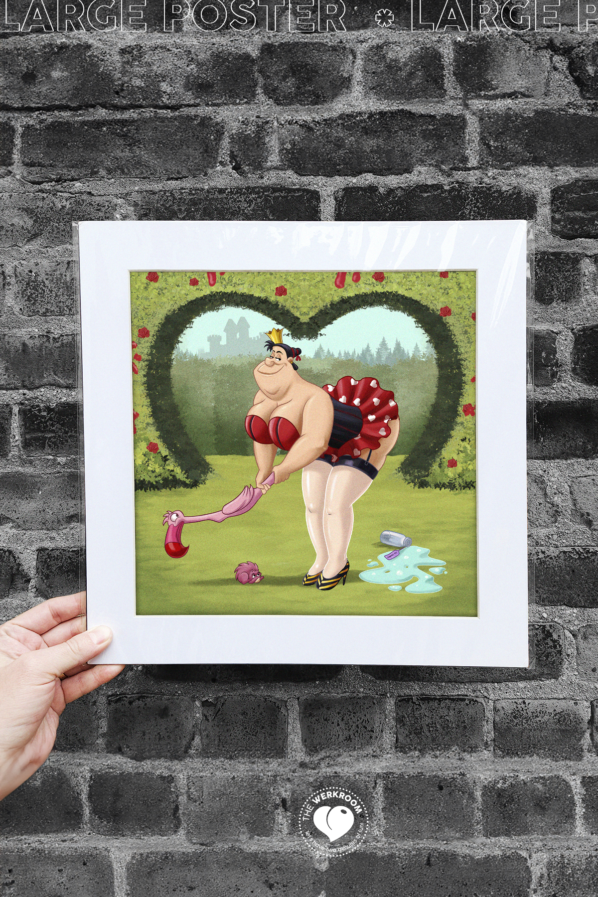 Add a new accent to your spaces with this Queen of Hearts matted poster. This original artwork has your favorite cartoon characters reimagined in a way you’ve never seen before.