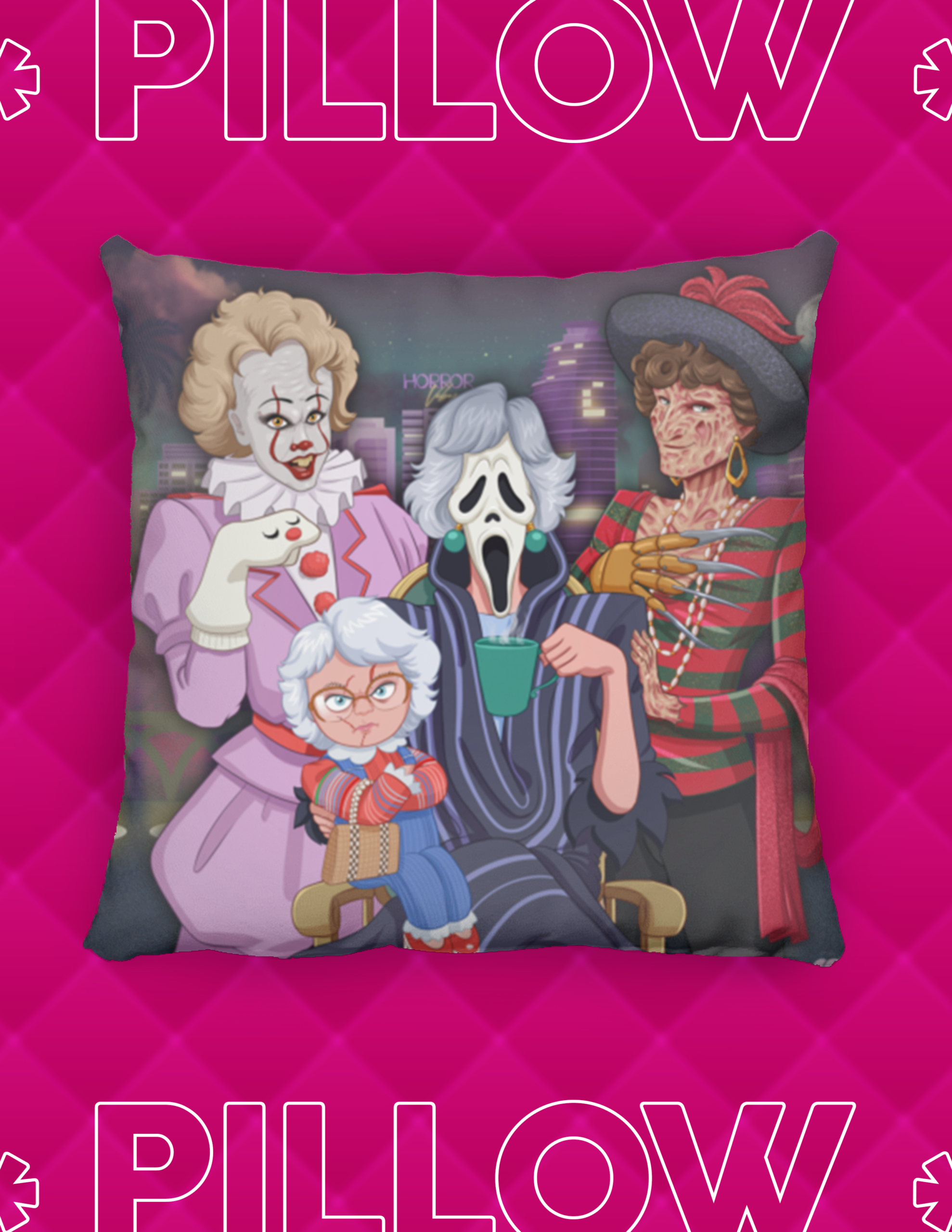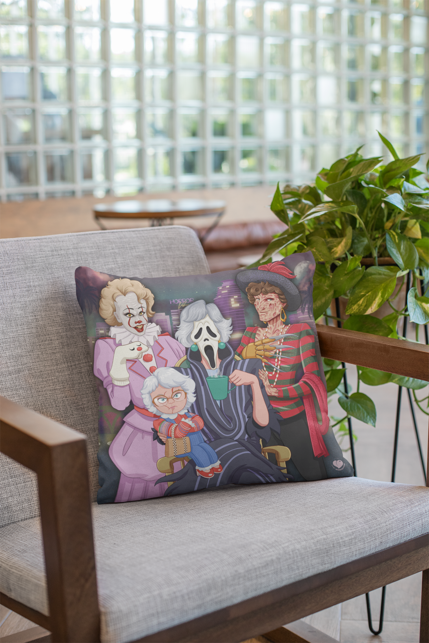 Add a pop of personality to your space with this Golden Girls Horror Parody throw pillow. Featuring original artwork that reimagines your favorite cartoon characters in a way you’ve never seen before, this decorative pillow blends comfort, attitude, and eye catching design. Perfect for couches, beds, and statement corners, it brings attitude, color, and a playful edge to your home decor.